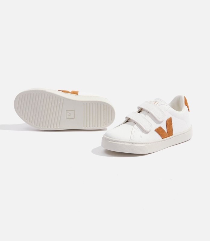 Upper: Chrome Free leatherPanels: Chrome Free leather and suede Logo V: SuedeInsole: Sugar cane (55%) and organic cotton (19%)Outsole: Amazonian rubber (24%) and rice waste (29%)Lining: Tech (100% recycled polyester)Straps: Chrome Free leatherMade in BrazilThe bovine Chrome Free leather is smooth and light. Coming from farms located in the south of Brazil (Rio Grande do Sul), it undergoes an innovative tanning process where no chrome, heavy metals or dangerous acids are involved. By simplifying the tanning process, the use of chemicals and energy is limited, the use of water is reduced by about 40% and the use of salt by 80%. After tanning, the water is recyclable. Chrome Free leather is used on the entire leather Kids collection.The suede is made from the underside of bovine leather previously brushed to make it softer and more flexible. It comes from farms in the south of Brazil (Rio Grande do Sul). It is tanned in Brazil, respecting the REACH norms. Special attention is paid to water usage during the tanning process. The suede is also coated with water-repellent oils without PFCs (chemical compounds) to protect the sneakers from light rain.